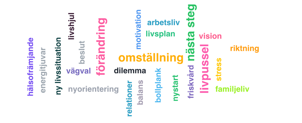 Till mig kan man komma av många olika anledningar. Coaching kan vara ett verktyg att ta sig från A till B. Många jag träffar är mitt i livet och vi pratar om hur man kan hantera sitt livspussel med familj, arbete, fritid, ekonomi, egen utveckling, hälsa, relationer med mera. Det kan också handla om att man vill ta ett nytt steg i karriären eller yrkeslivet. Vi kan komma tillrätta med energitjuvar, formulera framtidsplaner, sätta mål och skapa visioner.